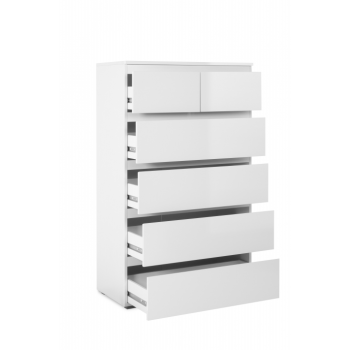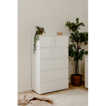Die Kommode Cordoba ist ein modernes Möbelstück, ideal, um Schlafzimmer oder Wohnzimmer stilvoll einzurichten. Die Front- und Oberplatten in Hochglanzweiß harmonieren perfekt mit den anderen Flächen in Mattweiß und schaffen einen eleganten Kontrast. Das grifflose (handleless) Design betont die klaren Linien, während die kratzfeste Melamin-Oberfläche und die ABS-Kanten für Robustheit und Langlebigkeit sorgen.