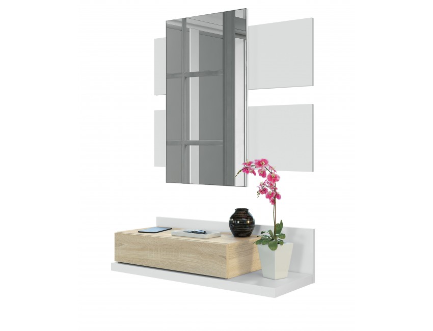 Wall-hung entrance cabinet 75x29x20 cm matt white and Canadian oak with mirror and drawer - Bari