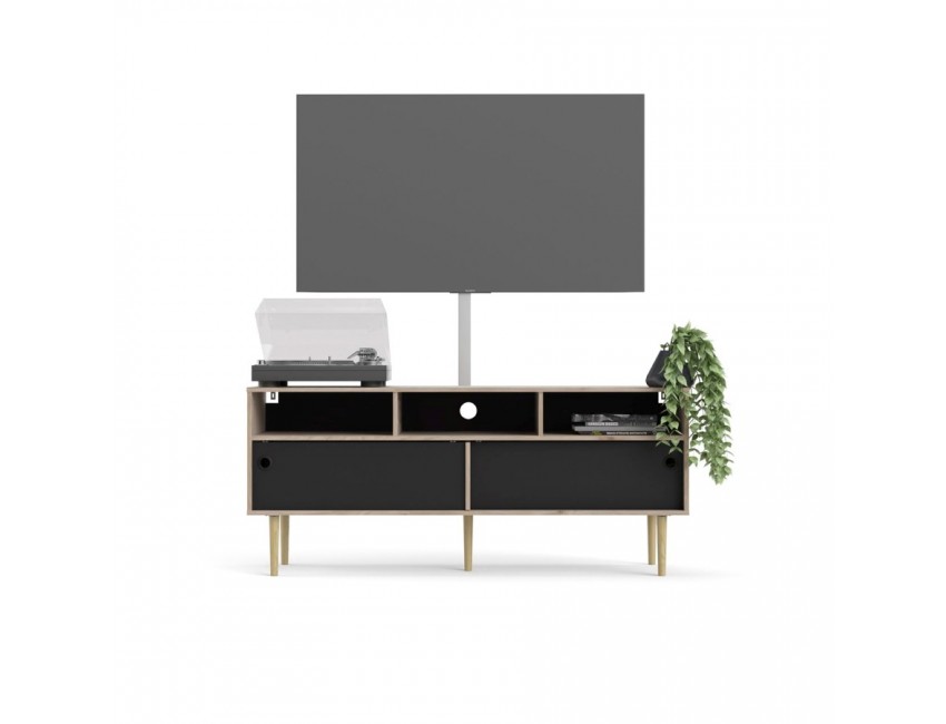 Living room TV stand with two sliding doors and three compartments in matt black and oak 147 cm - Luna