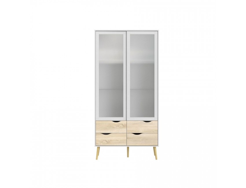 Vitrina para salón en blanco mate y roble con dos puertas y cuatro cajones 200 cm - Gladiolo