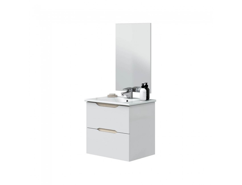 Meuble de salle de bain suspendu gain de place 60 cm 2 tiroirs blanc brillant et chêne avec miroir et lavabo encastré