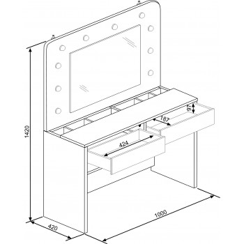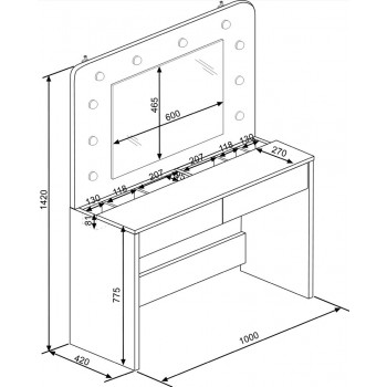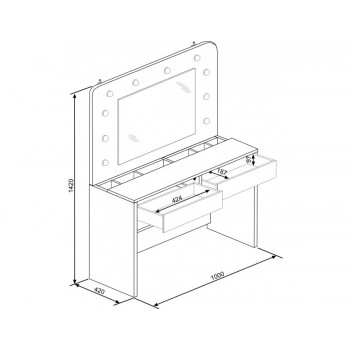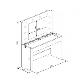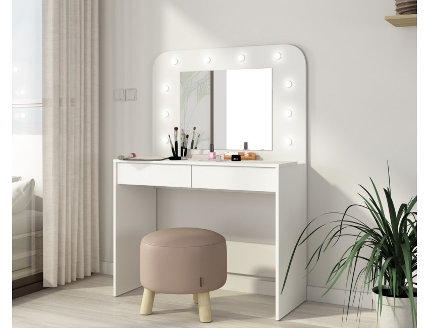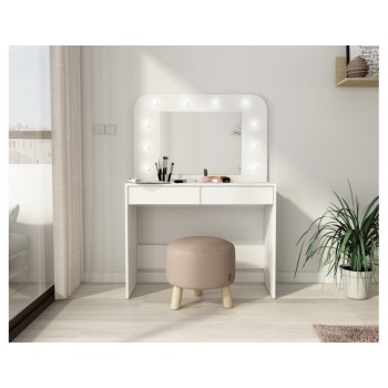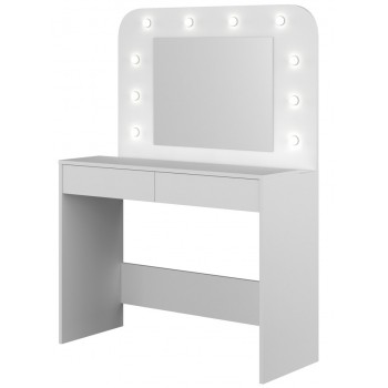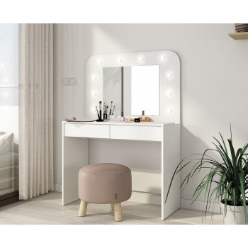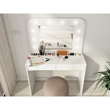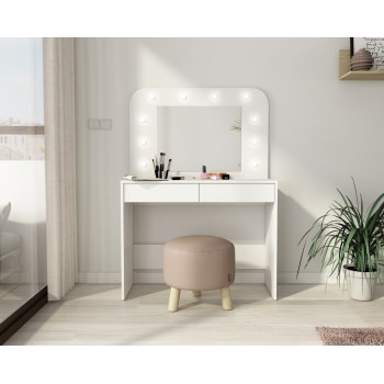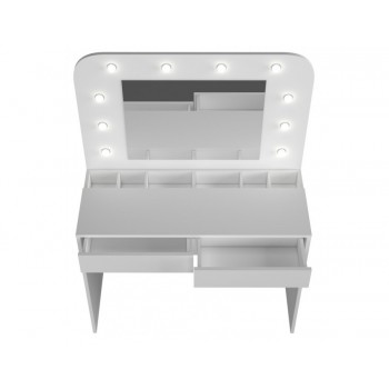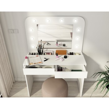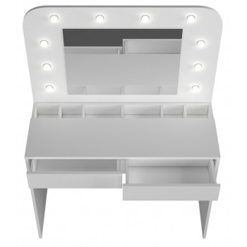 Ti piacerebbe avere una postazione dedicata totalmente al make up? Con il tavolo Sun potrai tenere sempre in ordine i tuoi trucchi e avrai finalmente un posto dove poterti truccare in tutta tranquillità e comodità. Questo moderno tavolo da toeletta, ha una colorazione bianco opaco, quindi facilmente adattabile a qualsiasi tipologia di arredamento. Inoltre è incluso uno specchio rettangolare con luci a led, molto gradevole esteticamente. Sono presenti due cassetti con guide in metallo, nella parte inferiore.
